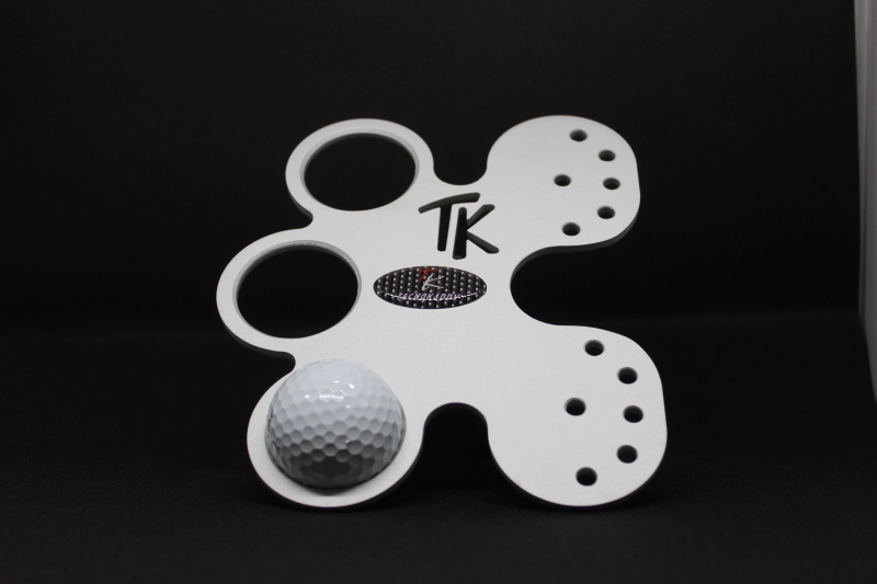 Portapalline e porta Tee lavorato a laser in in alluminio elettrolucidato.